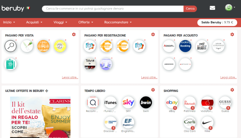 I CASHBACK. Un altro aspetto particolarmente interessante di BeRuby, è che esso funge anche da portale cashback: viene emesso, cioè, un accredito automatico di denaro a tuo favore, ogni qualvolta fai un acquisto online su uno dei tantissimi siti di e-commerce disponibili sul web (di qualsiasi genere esso sia: abbigliamento, informatica, biglietti aerei, soggiorni in hotel, assicurazione auto, telefonia, musica, libri, e tanto altro ancora!). Se sei una persona che effettua almeno 1-2 acquisti online tramite PayPal o carta di credito, pertanto, questa funzionalità è sicuramente molto vantaggiosa, perchè ti permette, di fatto, di riavere indietro una parte dell'importo che hai speso sui tuoi stessi acquisti online (da cui, appunto, la parola cashback= denaro indietro). La percentuale che riavrai indietro dipenderà dal negozio/sito nel quale hai effettuato l'acquisto, e può andare dal 2% al 10% (o anche più, in alcuni casi). Per usufruire della funzionalità "Cashback", basta accedere al proprio account BeRuby, entrare nella sezione "Acquisti" o "Viaggi" (qualora tu voglia acquistare un biglietto aereo, un soggiorno in hotel o noleggiare un'auto), scegliere il negozio/sito web nel quale intendi acquistare, e infine, completare l'acquisto. Entro 7-10 giorni max, vedrai sul tuo saldo BeRuby il riaccredito (cashback) di una parte dell'importo da te speso.