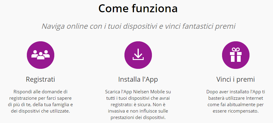 GUADAGNARE NAVIGANDO SUL WEB? Si, hai capito bene. Guadagnare online navigando sul web. Niente di più semplice! Tutto ciò è possibile grazie a Nielsen, un'importante azienda di marketing, che da anni si impegna a studiare le tendenze del web in maniera decisamente innovativa, oltre che efficace. Sostanzialmente, tutto ciò che devi fare è scaricare il software (o applicazione) di Nielsen sul tuo PC , smartphone, o tablet e navigare sul web come faresti normalmente: da quel momento in poi, ti verranno attributi dei punti per qualsiasi azione tu esegua online (ad esempio la ricerca di una parola chiave su Google, la visita di un determinato sito web, un acquisto online su Amazon, o qualsiasi altra operazione). Una volta raggiunta una determinata soglia di punti, questi vengono convertiti in fantastici premi, che sarai tu stesso/a a scegliere, da un catalogo. Una volta ricevuti i premi, potrai eventualmente decidere se rivenderli su Ebay e "trasformarli" così in denaro contante, oppure se tenere i premi per te. Piu' precisamente, parliamo di: elettrodomestici, articoli sportivi, elettronica, vacanze, buoni acquisto, e tantissimi altri articoli ancora. Cominciare a guadagnare online con Nielsen è estremamente semplice: devi solo completare l'iscrizione con tutti i tuoi dati e installare l'applicazione di Nielsen sul tuo PC, smartphone o tablet.